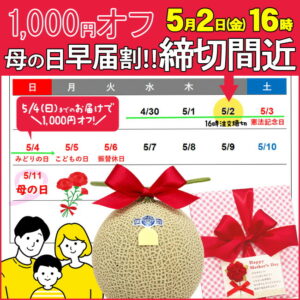 【オンラインショップ】連休前にかしこく節約!1,000円引き母の日メロンのご注文は5月2日(金)16時が締切りです!