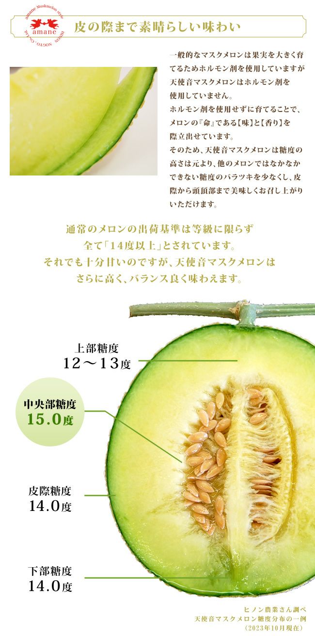 天使音メロンの魅力2 甘さの秘密 通常のメロンの出荷基準は14度以上とされる中、天使音メロンはそれ以上
